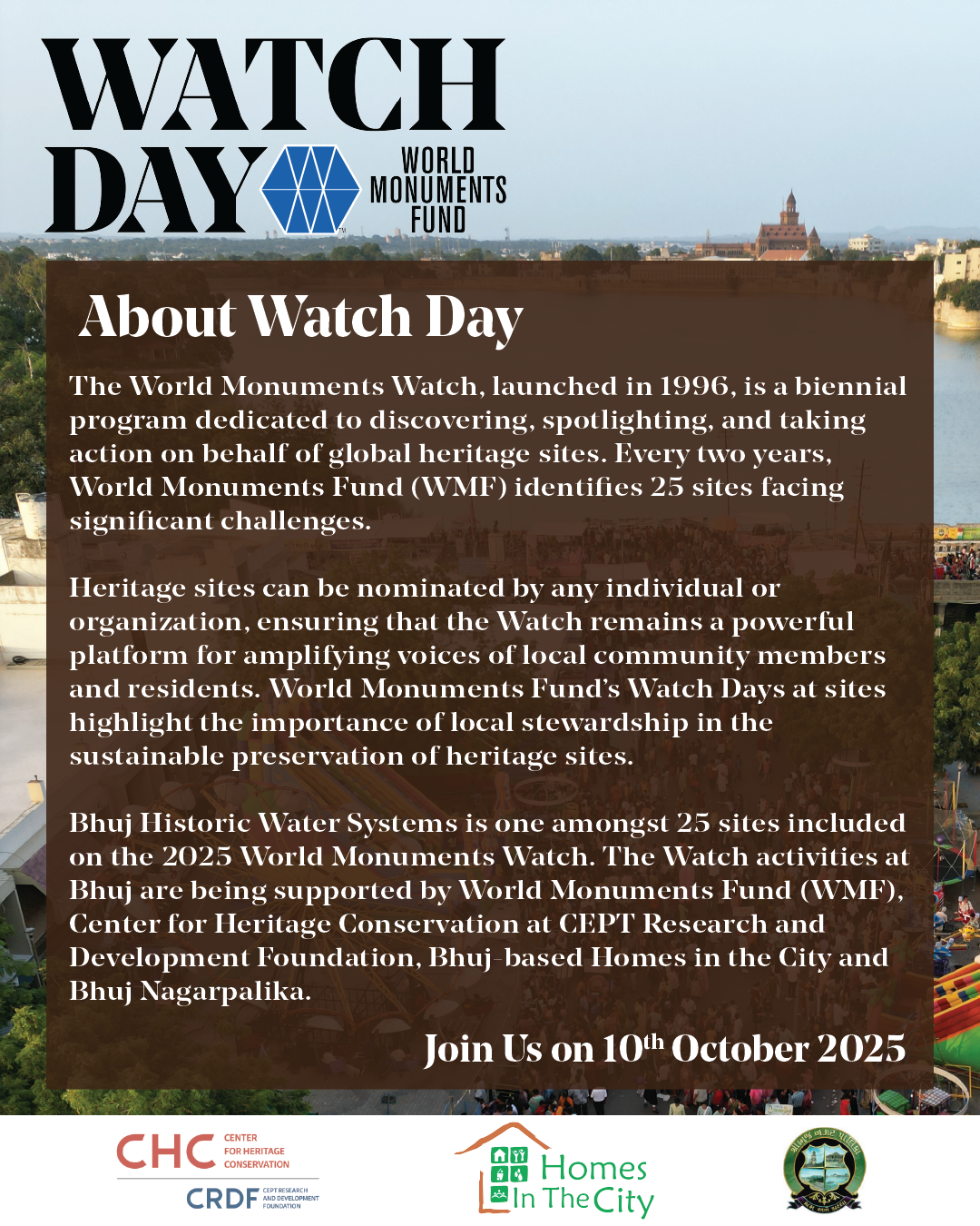 World Monuments Watch 2025 site ‘Bhuj Historic Water Systems’ is celebrating its Watch Day on October 10th, with a series of events, organised by World Monuments Fund India (WMFI), Center for Heritage Conservation at CEPT Research and Development Foundation, Bhuj-based Homes in the City, and Bhuj Nagarpalika.